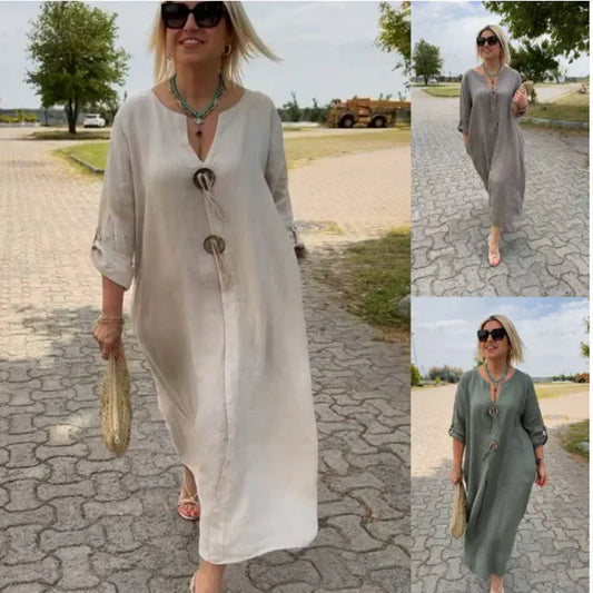 🎁👗Φόρεμα με V λαιμόκοψη από βαμβάκι και λινό-GR