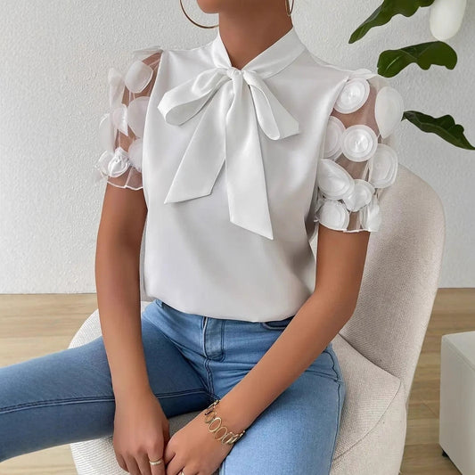 Camisa de verano, lisa, de encaje y con forma de lazo, con mangas cortas.-ES