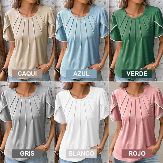 🔥Νέο γυναικείο casual μονόχρωμο μπλουζάκι με στρογγυλή λαιμόκοψη και δαντέλα-GR