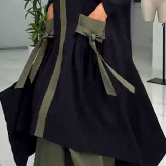 Moteriška elegantiška juoda suknelė su V formos iškirpte ir netaisyklingo švarko dviejų dalių komplektas-LT