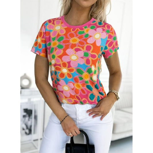 Moteriški rožiniai gėlių rašto marškinėliai-LT