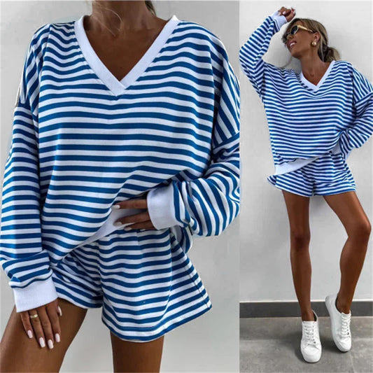 Dviejų dalių moteriška apranga Dryžuota V formos iškirpte Laisvi viršutinė dalis ir šortai