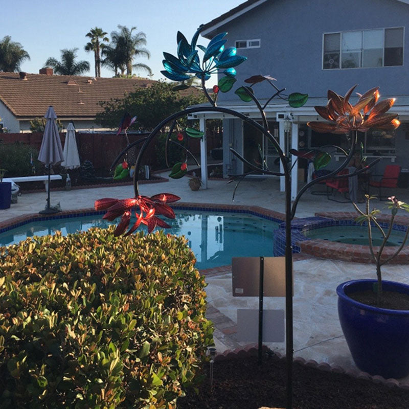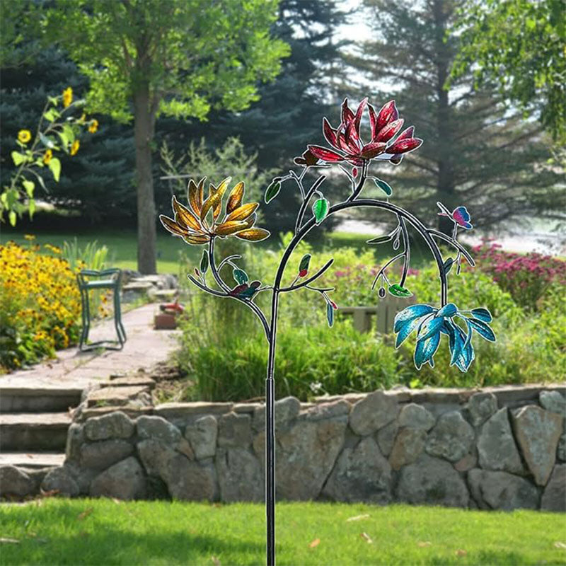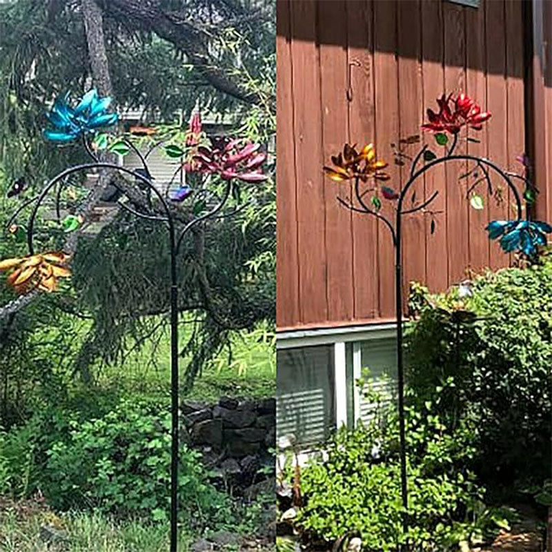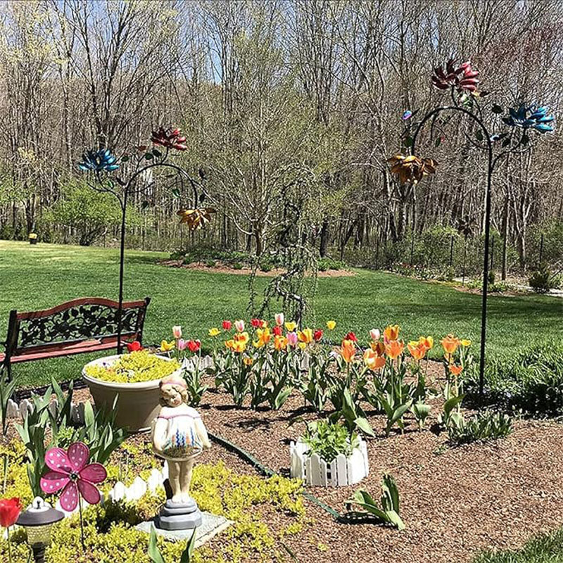 Disfrutarás de un hermoso molino de viento cinético al aire libre con tres filas de flores amarillas, rosas y azules y toneladas de mariposas. El llamativo y colorido estampado floral se mueve con cada ráfaga de viento.