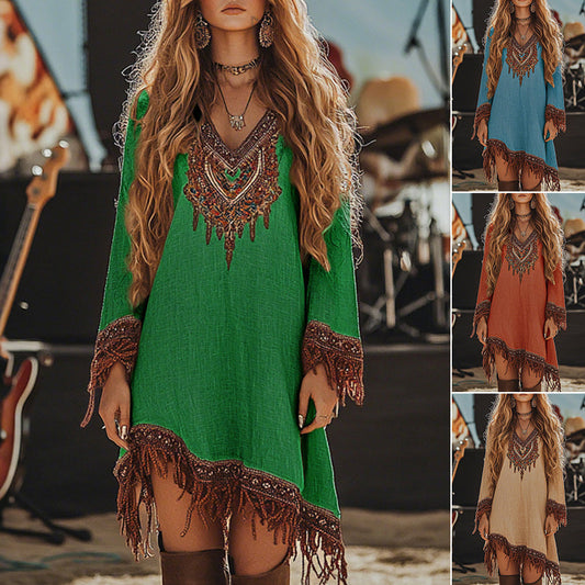 Γυναικείο φόρεμα με κρόσσια και ρετρό τύπωμα-GR