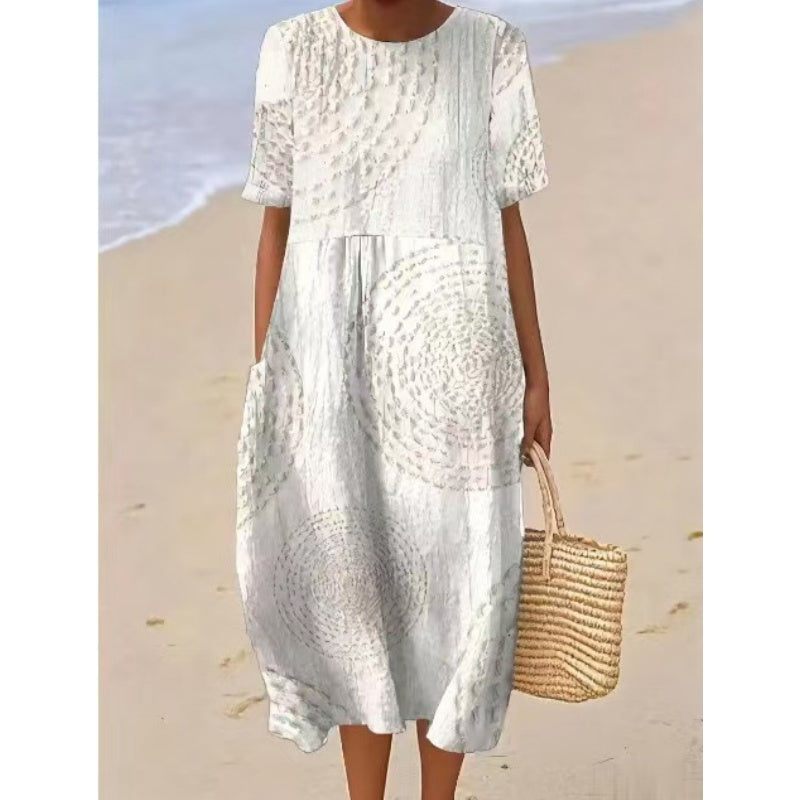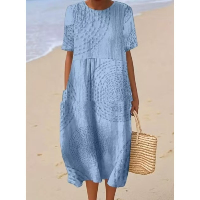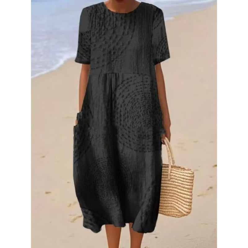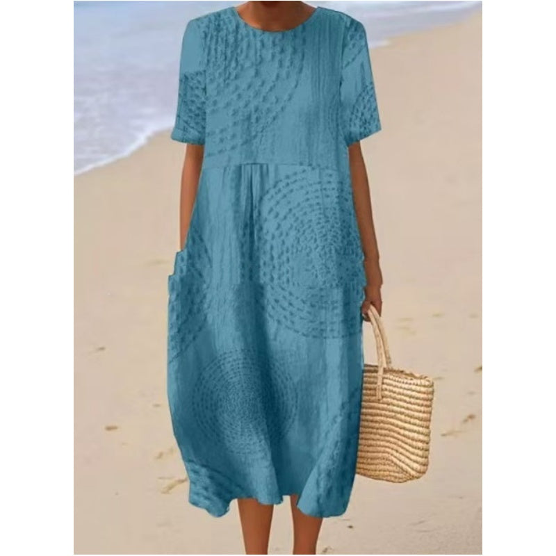 MINKŠTAS IR LENGVAS AUDINYS: Pagaminta iš minkšto, kvėpuojančio audinio, ši suknelė išlaiko vėsumą ir komfortą šiltu oru, tuo pačiu metu suteikdama moterišką siluetą.