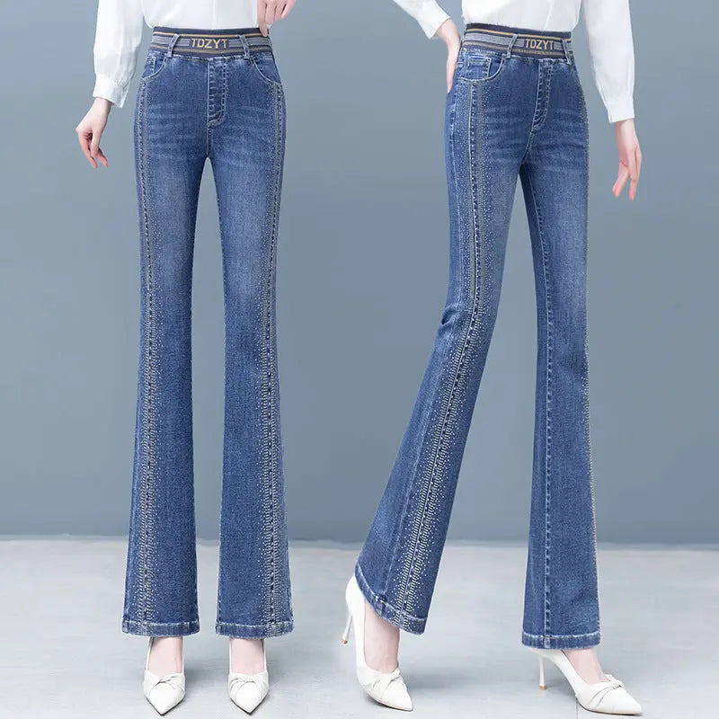 Moteriški džinsai su plačiomis kojomis aukštu juosmeniu ir elastine juostele yra stilingas, retro stiliaus pasirinkimas moterims, kurios vertina klasikinį, tačiau šiuolaikišką išvaizdą. Šie džinsai sukurti taip, kad apkabintų jūsų kūną ir išlygintų jūsų išlinkimus, tuo pačiu užtikrinant patogumą ir lankstumą.