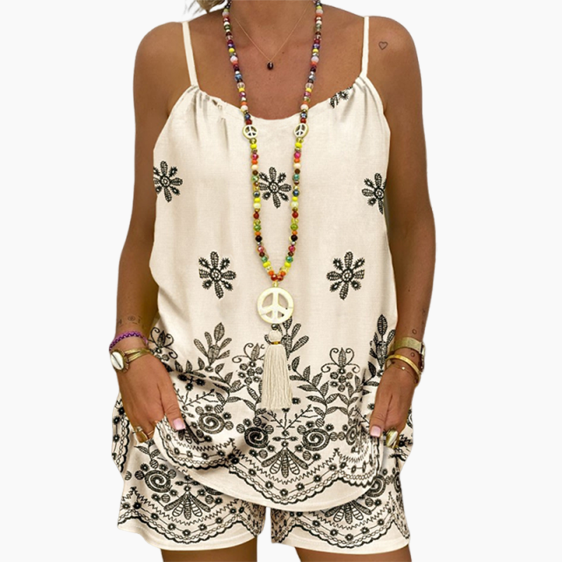 Paket uključuje 1* ženski top s printom i kratke hlače s naramenicama.