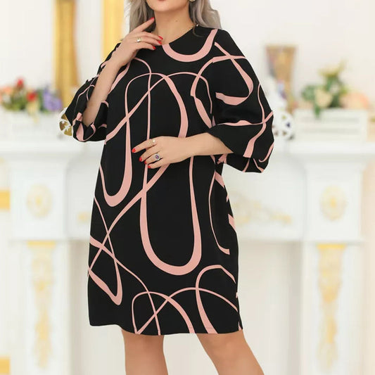 🌸 Raštuota suknelė apvalia iškirpte ir septynių ketvirčių rankovėmis-LT