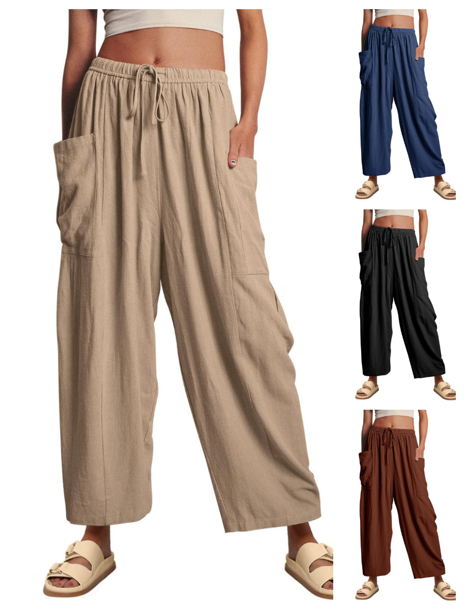 Naujausios vasarinės kelnės laisvo, haremo įkvėpto silueto su įsiūtomis šoninėmis kišenėmis.