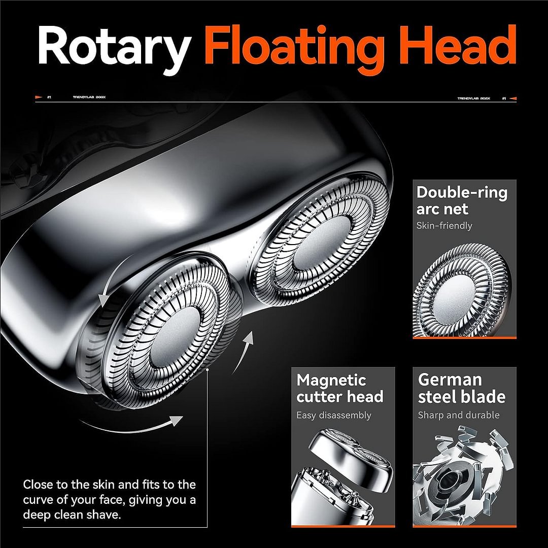 Ostro vrtljivo rezilo iz nerjavečega jekla, posebej zasnovano za trde brade, 0,1 mm tanka folija iz nerjavečega jekla, dvojna obročasta mreža 3D rezila, poveča volumen britja, zgladi površino lebdečega loka in odstrani dlake s kože.